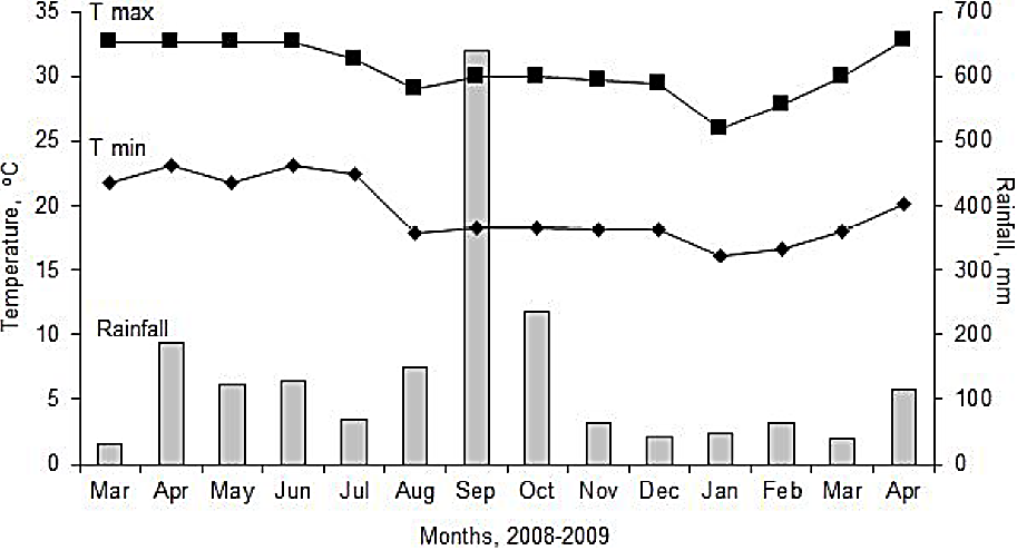 The experiment was carried out at the Centro de Enseñanza, Investigación y Extensión en Ganadería Tropical of the Facultad de Veterinaria of the Universidad Nacional Autónoma de Mexico (CEIEGT, FMVZ-UNAM), located in Tlapacoyan, Veracruz, Mexico, at an altitude of 114 m. Soils are acidic (pH 4.5 to 5.2), clay-silt Ultisols (durustults), low in available P (3.5 ppm, Bray II) and cation exchange capacity (10.5 meq 100 g-1). Soil has a 25 cm deep hardpan, causing a deficient drainage during rainy and winter seasons. In the dry season, water available to plants is rapidly depleted, because the soil does not hold much moisture. Climate is hot and humid, Af(m)w"(e)13. Yearly average daily temperature is 23.9 ± 0.5 °C, and rainfall is 1931 ± 334 mm. Figure 1 shows rainfall and temperatures registered during the three phases of the experimental period: first, from March 6 to May 29, 2008 (Tmin= 22.2, Tmax= 32.6 °C, 342 mm); second, from August 1 to October 24, 2008 (Tmin= 18.1, Tmax= 29.6 °C, 1,025 mm); and third, from January 30 to April 24, 2009 (Tmin= 18.2, Tmax= 30.2 °C, 217 mm). Rainfall in the first and third cycles was 33 and 20 %, respectively, of the rainfall registered during the second cycle.