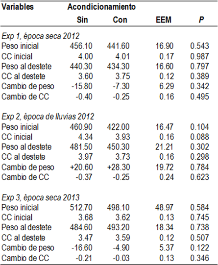 El peso de las vacas al inicio y al destete fue similar entre tratamientos (Cuadro 1). En los experimentos 1 y 3, durante los 28 días previos al destete, las pérdidas de peso de las vacas madres de becerros sin acondicionamiento fueron entre 15 y 17 kg de peso, mientras que las madres de los becerros acondicionados y suplementados solo perdieron entre 5 y 7 kg, (P>0.05). En el Exp 2 (época de lluvias), durante los 28 días previos al destete, las madres de becerros incrementaron su peso en 20.6 kg (testigo) o 28.3 kg (acondicionados) (EEM ± 19.72 kg; P= 0.784). Considerando los tres experimentos, la CC de las vacas no disminuyó entre el inicio de la prueba y el destete debido a los tratamientos evaluados.