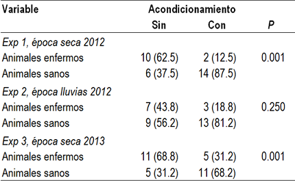 En los Exp 1 y 3, los becerros acondicionados tuvieron menos incidencia de enfermedades que los becerros del grupo testigo (P=0.001; Cuadro 4). En el Exp 2, la incidencia de animales enfermos fue similar entre ambos tratamientos durante los 112 días que duró el estudio.