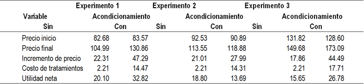 La información económica recabada para los animales acondicionados fue de tres rubros de gastos: control o manejo sanitario, suplemento alimenticio y mano de obra. Se consideraron los costos del desparasitante, vacunas, vitaminas y material utilizado, que dio un total de $23.09 MN/animal. El suplemento se consumió en su totalidad (no hubo rechazo) y se registró un consumo promedio de 106.27 kg. El suplemento tuvo un costo de $7.17/kg, que multiplicado por el consumo, dio un costo de $761.95/animal. El costo de mano de obra ($130.18/animal) se calculó considerando el pago mensual del personal en cada unidad de producción (vaqueros y caporales) para el número de animales que manejaron durante los cinco meses que duró el estudio. Para los animales no acondicionados solo se consideró el gasto de mano de obra ($130.18/animal), pues no se tuvieron gastos de manejo sanitario ni suplementación. Para los cálculos económicos se consideró el precio ponderado a nivel nacional al mes de mayo de 2015, de $40.26/kg, publicado por la Secretaría de Economía25.