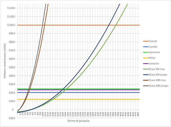 El umbral económico es el momento oportuno de aplicar el control químico con el fin de impedir el daño producido por las garrapatas, y también evitar un gasto monetario innecesario por el tratamiento. En la Figura 2, el UE es la intersección entre las líneas del daño económico y las del costo del tratamiento anual por bovino. En Australia, en 1983 se estimó un umbral económico de 158 garrapatas ingurgitadas por animal por día, aunque no se menciona el acaricida que se empleó para este cálculo16, y en el 2001 utilizando el programa de Sutherst25 se estimó un umbral económico de 100 garrapatas por cabeza26; en Paraguay con una mezcla organofosforado/piretroides se calculó UE de 53 garrapatas por animal en 1988/1989 y 54 en 1990/1991 con las razas Santa Gertrudis, Brahaman y Nelore27. En un manual técnico para productores se recomienda comenzar a tratar cuando se observen más de 30 garrapatas, sin embargo no es claro cuál es el argumento con el que se obtuvo este número28.