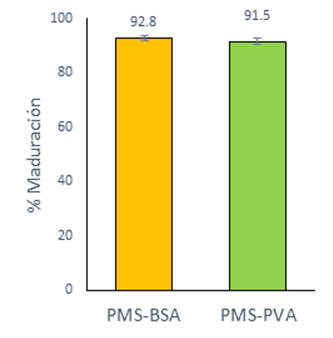 No hubo diferencias significativas en la maduración de ovocitos entre el grupo PMS-BSA (92.8 ± 0.9 %) y el grupo PMS-PVA (91.5 ± 1.3 %) (Figura 2). Sin embargo, el porcentaje de fertilización monoespérmica fue significativamente menor (42.3 ± 3.1 %; P<0.05) cuando los ovocitos se maduraron con PMS-BSA que en los madurados con PMS-PVA (52.6 ± 3.3 %) (Cuadro 4).