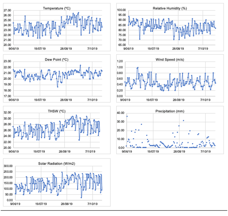 Figure 1 shows the environmental conditions observed during the evaluation period. According to the records obtained at the experimentation site, the average temperature was 23.9 ± 1.2 ºC, the relative humidity was 83.4 ± 5 %, the average dew point was 20.8 ± 0.6 ºC, the wind speed was 0.7 ± 0.2 m/sec, the average THSW index was 26.7 ± 2.1 ºC, solar radiation 147 ± 53.3 W/m2 and the accumulated precipitation was 556.2 mm.