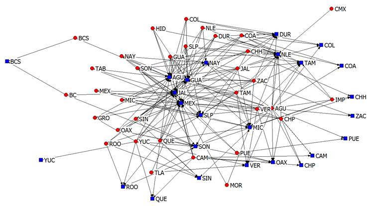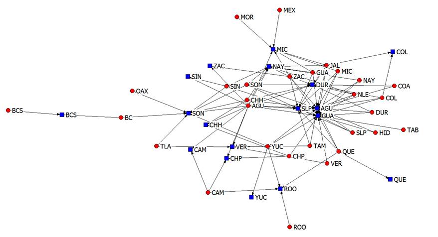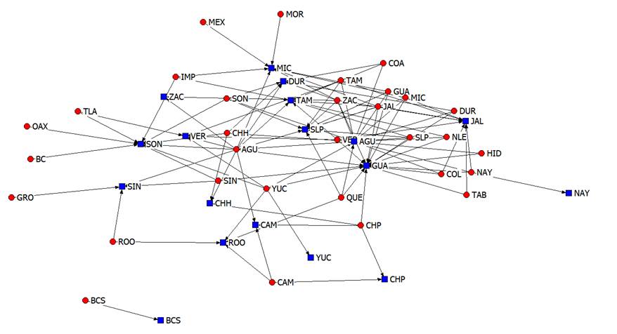 For the bull meat market, a density of 19.7 ± 39.8 % was found, the lowest of the four products analyzed. The slaughter centers of Aguascalientes and Guanajuato had exchanges of bull meat with 58.6 ± 49.3 % of the supply centers, others such as San Luis Potosí 31.0 ± 46.26 %, Durango and Nayarit 31.0 ± 46.3 %. The supply centers of Aguascalientes had exchanges with 72.2 ± 44.8 % of the slaughter centers, Jalisco and Zacatecas 38.9 ± 48.8 %, in addition to Guanajuato, Querétaro and Sonora with 27.8 ± 44.8 % of their relations with the supply centers (Figure 5).