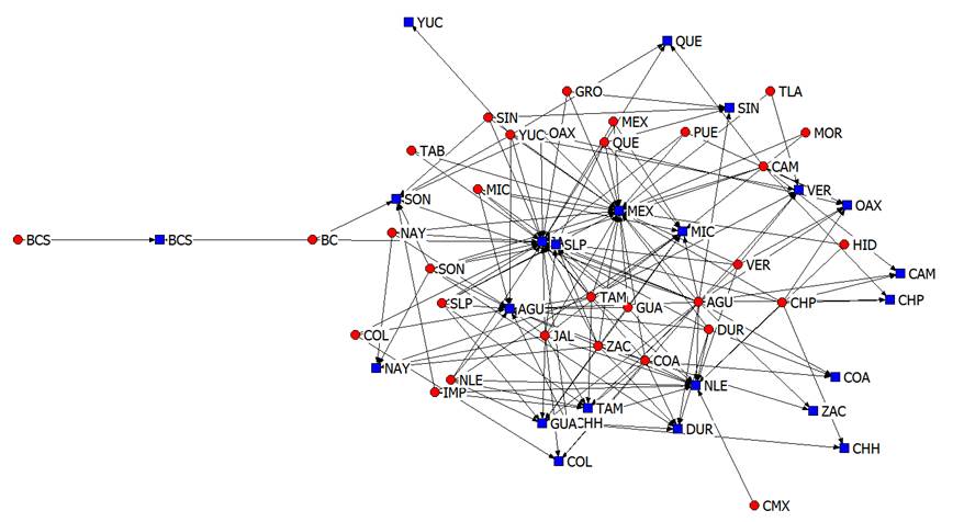 In the case of heifers, the relation of the slaughter and supply market reduces. The market of Baja California Sur is isolated from the domestic market. The average of all possible relationships was 19.4 ± 39.5 %, which means low network density and variability. The slaughter centers with the highest nodal degree or degree of influence were Aguascalientes and Guanajuato with 54.9 ± 50.1 %. Likewise, the supply centers with the greatest influence were Aguascalientes 66.7 ± 47.1 % of the supply centers, Zacatecas 38.9 ± 48.8 %, Jalisco and Yucatán 33.3 ± 47.1 %, respectively (Figure 3).