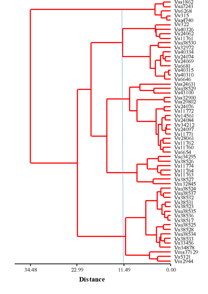 Figure 2 Dendrogram of 58 populations of Vicia spp. explained by complete linkage clustering of 12 traits