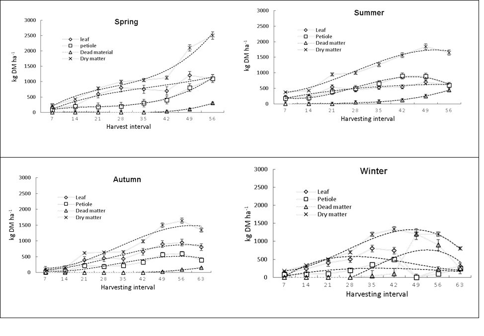 Figure 2 White clover growth curves by season and by morphological component during a growth cycle of 8 and 9 weeks