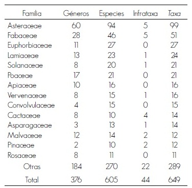 Se determinaron 605 especies y 44 infrataxa de plantas registradas como medicinales, pertenecientes a 105 familias y 375 géneros (Cuadro 1). De estas, 14 tienen estatus de riesgo en la NOM-059-SEMARNAT-2010, cuatro están con la categoría de amenazadas, siete con protección especial y tres en peligro de extinción (Cuadro 2). El mayor número de especies e infrataxa registradas son de las familias Asteraceae, Fabaceae y Euphorbiaceae con 97, 52 y 27, respectivamente. La riqueza genérica más alta por familia correspondió a Asteraceae (58), Fabaceae (28) y Poaceae (17). En estas se ubica alrededor de la tercera parte de la riqueza de especies y de géneros (30.5 y 30.9%, respectivamente) de las plantas medicinales para Chihuahua (Cuadro 1). Del total de las plantas medicinales identificadas 86% son nativas, mientras que el resto son introducidas, y de ellas, 7.9% son cultivadas y algunas son ornamentales.