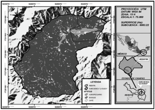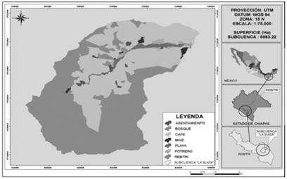 The research was conducted in the La Suiza watershed located in Guerrero and Mapastepec municipalities, in the state of Chiapas, Mexico (Figure 1), with a total area of 6 083.22 ha and a perimeter of 37.48 km. A large percentage of its territory (85.32 %) is located within the polygon of the El Triunfo Biosphere Reserve (REBITRI) on top of the Sierra Madre de Chiapas (Gutiérrez, 2013). Here prevails a wet and temperate semi-warm climate humid (INE, 1998), with altitudes between 1 000-2 600 m, an annual rainfall of 2 000-3 000 mm on the bottom and from 2 500 to 4 500 mm at the top, distributed from April to October. The annual average temperature is 18 to 22 °C at the bottom and 12 to 18 °C at the top.