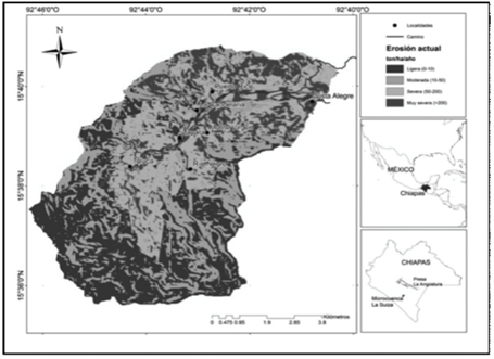 Figure 6 shows that in 39 % of the area of the watershed there is a severe and very severe erosion rates of soil loss above the 50 t ha-1 yr-1 corresponding to the middle and lower parts where coffee and maize grows (FAO, UNEP and UNESCO, 1980). Maize is distinguished as the basis of food security of the local population and also because it grows on the most fragile soils that have poor coverage and slopes are 60 to 70 %. Coffee represents 95 % of household income on average and although its cultivation under shade protects the soil from raindrop impact, it is affected by runoff during the rainy season. This dynamic interaction between local population and ecosystems for the production of food from agriculture in areas not suitable for agriculture it is recorded as the main threat to the sustainable generation of ES at a local and global scale (Balvanera and Cotler, 2009).