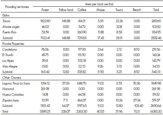 Within the 6 083.22 ha of La Suiza watershed there are 1 ES generating territories, of which three are ejidos that cover 46 % of the area, four locations with other types of tenure covering 45 % and four private properties totaling 9 % of the area. The Toluca ejido is the most extensive with 2 662.7 ha, equivalent to 39.7 % of the watershed. With the exception of Nueva Colombia and Laguna del Cofre the rest of the territories have their villages within it.