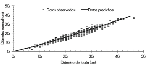 The fit of the model (2) shows a linear trend between stump diameter and normal diameter, a good statistical fit, a reliable prediction of the dependent variable and low bias in the estimates. The inclusion of stump height (ht) as an independent variable in the estimation models of dn through dt, significantly improves the predictions achieved.