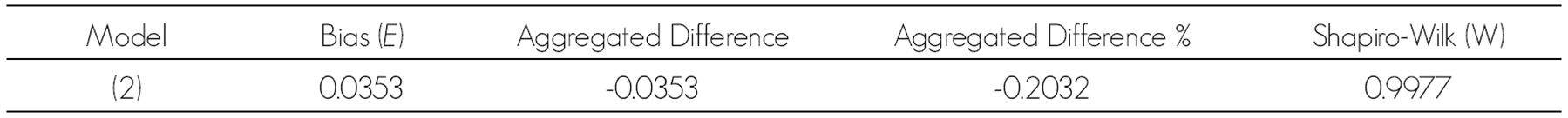In Table 4 are summarized the values that assess the predictive ability of model (2), the deviation of their estimations and the results of the Shapiro-Wilk tests of normality of errors.