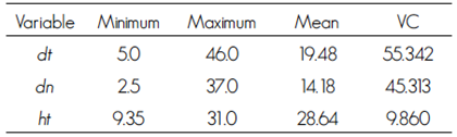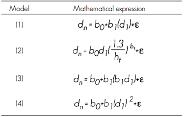 It can be observed that in models (1) and (3) the b0 parameter and its estimators of fit are identical, from the mathematical structure of the equations, b0 points out to the interception between dt and dn. Also, it is evident that the values of the approximate standard errors of the b0 parameter in these two models are higher compared to the value of the same parameter of model (2), which has a different interpretation, as it considers the height at which the measurement of dt was taken.