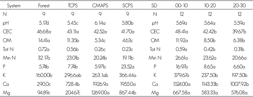 As for the organic matter (OM), the variance analysis revealed significant statistical differences (α < 0.05), with P < 0.0001, in the four assessed systems. The one with the lowest percentage was the SCPS, followed by the CMAPS and the TCPS. In contrast, the Forest registered the highest percentages for this variable, which is associated with the vegetal cover. As the soil depth increased, the organic matter diminished in all systems, since the largest input for this variable occurs at surface level (Soto et al., 2007). In this case, the presence of dead leaves fallen from the canopy is confirmed, reflecting the management practices used in all the systems, the SCPS included, which have not been intense enough to affect the organic matter contents. When the NOM-021- RECNAT-2000 norm was applied to the results obtained for this variable, the SCPS and the CMAPS had a low percentage of OM, unlike the Forest and the TCSP. Organic matter diminishes with a more intense use of the soil. Forest soil disturbance reduces the organic matter contents, since the vegetal cover tends to be removed, which favors an increase in temperature and, consequently, in microbial activity, as well as a rapid mineralization of the substrate, that eventually cause its loss.
