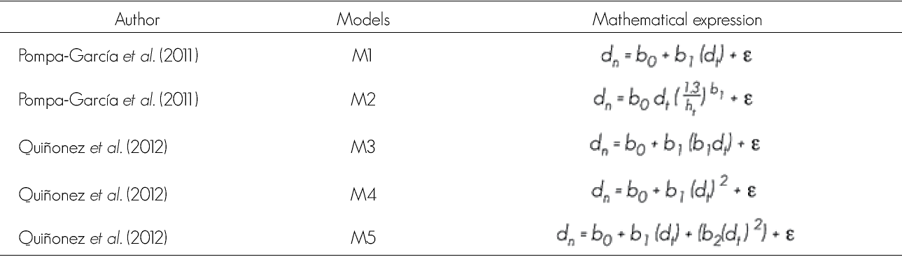 The models utilized were those proposed by Quiñonez et al. (2012) and Pompa-García et al. (2011) for the estimation of the SD from the ND, given that this section has the shape of a truncated neiloid (Table 1).