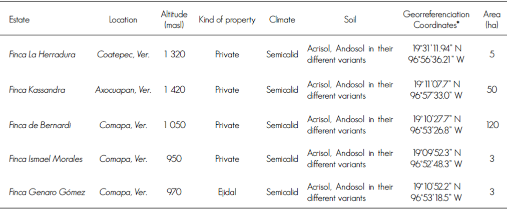 The research was carried out in the coffee plantations of the center of Veracruz. Five estates were selected to perform the fieldwork for being cooperating and having a broad knowledge of the coffee production system. In the region of Huatusco were located four (Finca Kassandra, Finca de Bernardi, Finca Ismael Gómez and Finca Genaro Morales); for the second site, Coatepec, Finca La Herradura was visited) (Table 1).