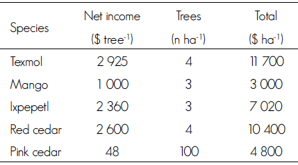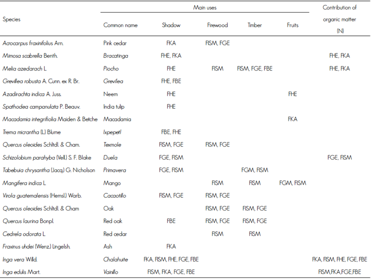 Table 4 lists the species with timber characteristics recognized by the producers. There are other coffee regions in which the tree species have also been incorporated; thus, in an agroforestry system in Chiapas, Soto (1999) recorded more than 60 woody species in the tree stratum, which are used as food (49.1 %), firewood (31.8 %), and rural construction (10.4 %), as well as others such as the manufacture of handicrafts, live fences, domestic tools, resins, dyes, condiments, dead fences, ornamental and medicinal uses.