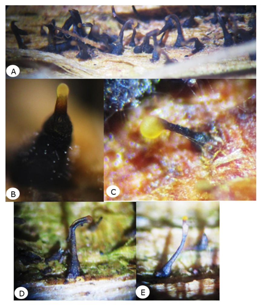 A. Grouping of pycnidia on wood. B - C. Pycnidia on bark with mass of conidia in the ostium. D-E. Pycnidia on wood with mass of conidia in the ostium.