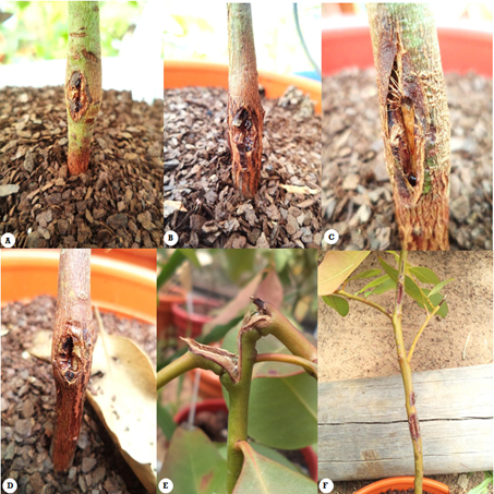 A, B, C, D. Seedlings with presence of exudates of reddish hue at the inoculation site. E. Primary bifurcated or dead meristems. F. Galls along seedling stem.