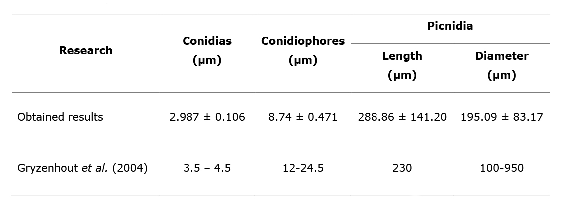 Table 3 Size of conidia, conidiophores and pycnidia of Chrysoporthe cubensis Brunes Gryzenhout & M. J. Wingf.