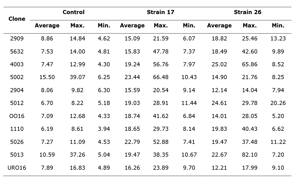 With strain 17, a 22.2 % mortality rate was verified, corresponding to 20 of the total assessed (90) in this treatment; the clone with the highest number of deaths was 5 013 with 30 % of the seedlings in the treatment described, followed by 5 632 (20 %). Finally, in the control, the death of five seedlings was recorded in the last measurement, which constitutes 5.68 %, of which three were of clone 1 110 (Table 7).