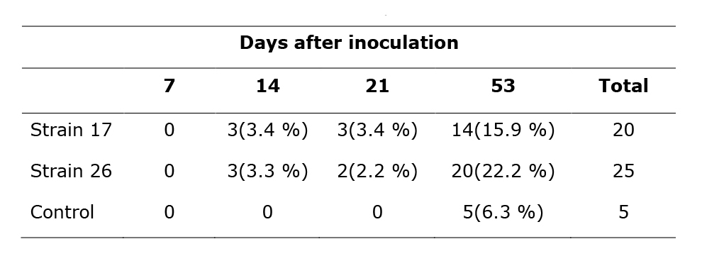 The disease progressed gradually and caused the death of several of the evaluated seedlings (Table 7). Treatment with strain 26 brought together the largest number of dead individuals (25). Clones 5 026 (20 %) and 5 002 (16 %) achieved the highest mortality rates attributable to treatment.