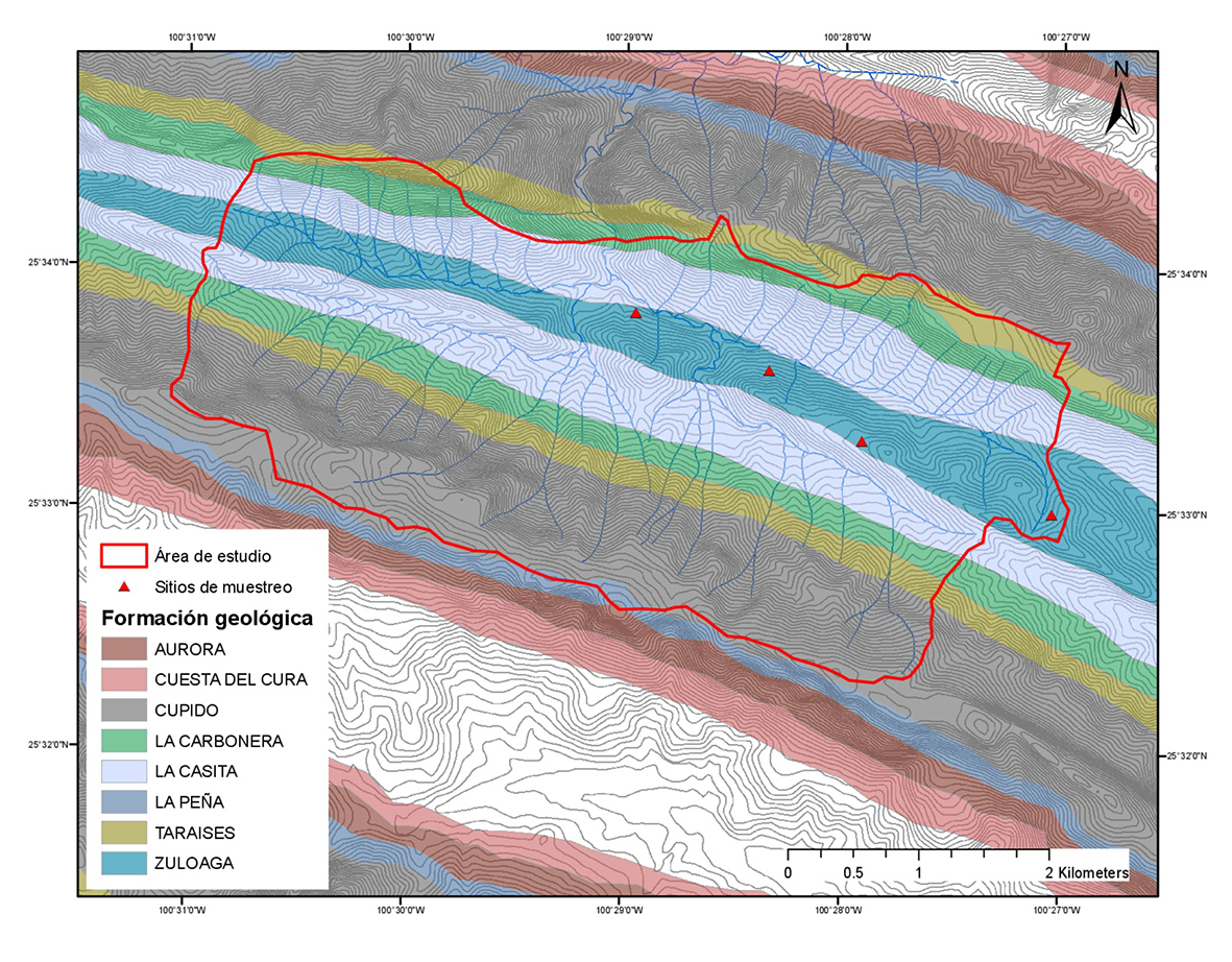 Área de estudio = Study area; Sitios de muestreo = Sampling sites; Formación geológica = Geological formations