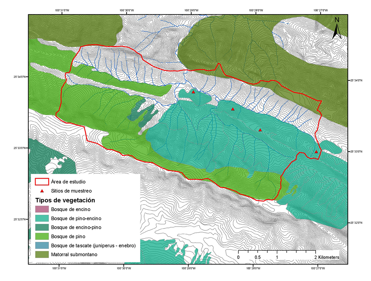 Área de estudio = Study area; Sitios de muestreo = Sampling sites; Tipos de vegetación = Vegetation types; Bosque de encino = Oak forest; Bosque de pino-encino = Pine-oak forest; Bosque de encino pino = Oak-pine forest; Bosque de pino = Pine forest; Bosque de táscate (juniperus-enebro) = Juniper forest; Matorral submontano = Submontane shrub