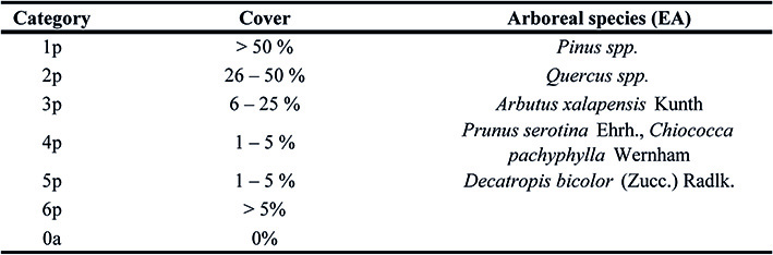 A basic table of cover categories (Table 1) was used to establish potential cover categories according to the consulted information (Table 2). Based on the cover obtained in field, a current cover category was assigned to each registered arboreal taxon. The categories obtained from the comparison were later correlated with a matrix (Table 3).