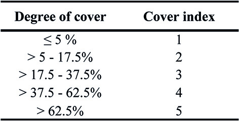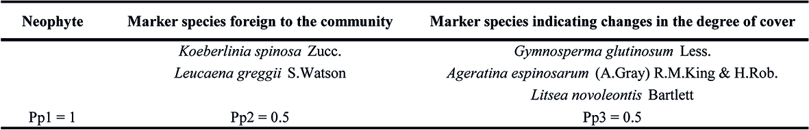 Criterion 2 (composition of the shrub and herbaceous strata). The presence and relative cover of species indicating disturbance in both strata were assessed; the neophyte and native species that are foreign to the assessed vegetal community were considered, as were the species that indicate changes in the cover of the respective stratum, based on the information available in the literature. Specific categories were established for the comparison (Table 4). A cover index was obtained for each of the taxa belonging to one of the categories, based on a matrix (Table 5).
