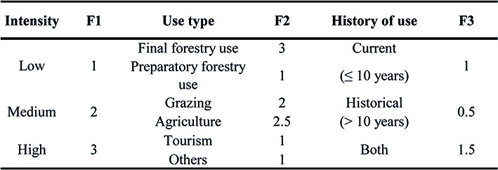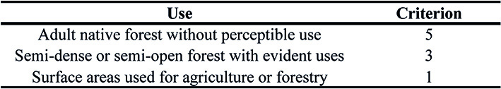 Criterion 4 (use of vegetation). The intensity, type and use history of the vegetation in the study area were estimated based on personal communications with the owner of the plot and direct in-field observation of the factors involved in each use type. For example, in order to evaluate the intensity in the use type “grazing”, the presence and number of cattle, the perceptible compacting of the soil, the appearance of the vegetation and the disturbance marker species brought about by overgrazing. The correspondence factors were established (Table 8).