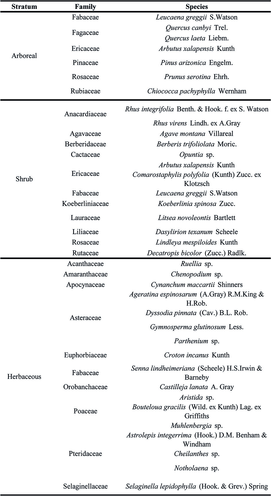 A total of 36 species were registered, corresponding to 34 genera and 23 families (tables 14 and 15). The arboreal stratus of the vegetation is dominated by Quercus canbyi Trel. (index of importance value: 92.51), Pinus arizonica Engelm. (64.17) and Quercus laeta Liebm. (55.98); and the shrub stratum is dominated by Rhus virens Lindh. ex A.Gray (51.73), Leucaena greggii S.Watson (48.50), and Decatropis bicolor (Zucc.) Radlk. (46.53). In the herbaceous stratum, the most dominant species are Gymnosperma glutinosum Less. and Ageratina espinosarum (A.Gray) R.M.King & H.Rob. (tables 16, 17 and 18).