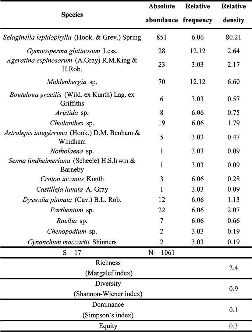 Marker species for disturbance, such as Gymnosperma glutinosum and Leucaena greggii (González-Elizondo, 1996; Estrada-Castillón et al., 2013) were found in all the sites, most abundantly in site 1. The former is dominant in the herbaceous stratum, and the latter, in the shrub-arboreal stratum.