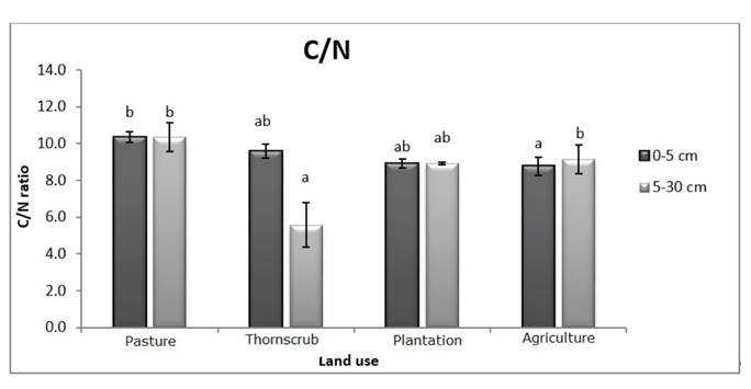 The C/N ratio, in general, was low for all systems of land use, with variations between 5.6 (thornscrub) and 10.3 (pasture); this is considered to be a good proportion for the mineralization of the SOM. The Tukey’s test indicated significance for the two depths. At the 0-5 cm depth, the agricultural use exhibited the highest C/N ratio (8.7), equal to that of the plantation and the thornscrub, but different from that of the pasture (10.3). Conversely, at the 5-30 cm depth, the thornscrub had the best C/N ratio (5.6), unlike the pastures and agricultural lands, which had 10.3 and 9.1, respectively (Figure 5).