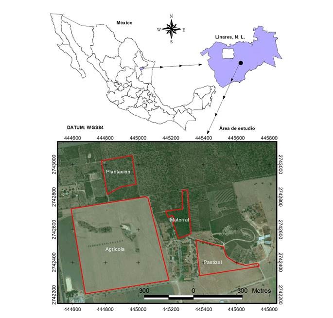 Four experimental lots with various land uses were selected in the research state for the assessment of their soil organic carbon (SOC) and total nitrogen (TN) contents and their C/ N ratio. The first condition was a Tamaulipan thornscrub plot, native vegetation dominated by various dense and thorny shrubs, characterized by a broad range of growth patterns, various life stages of the leaves, and textures and growth dynamics with contrasting taxonomic and phonological developments. In terms of productivity, the average aerial biomass of the thornshrub and its annual production in dry weight have been determined to be 22 Mg ha-1 and 3.2 Mg ha-1 year-1, respectively (Villalón, 1989). The second land use corresponds to a Eucalyptus globulus Labill. plantation and a E. camaldulensis Dehnh. plantation; both species were planted in 3 m × 3m squares, 33 years ago, for research purposes. The third land use was a plot with pasture, corresponding to a production system with intensive stockbreeding and pasture rotation. The perennial grass species established in the area is Dichanthium annulatum (Forssk.) Stapf (Bluestem), which forms bunches up to 60 cm tall. The fourth land use was a Sorghum bicolor (L.) Moench crop in a field under rain feeding conditions together with the implementation of conservation agricultural practices, where the protective layer of residues from each crop brings various environmental and soil management benefits, including the stabilization of the temperature and of the levels of soil moisture.
