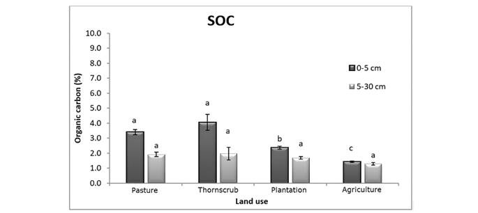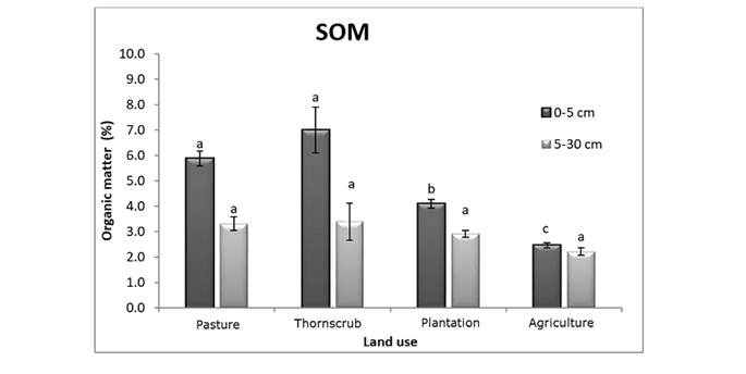 No differences were found between the SOM and the SOC at the depth of 5-30 cm for the different land uses. The SOM and TN contents at both depths for the different land uses follow this order: Thornscrub > Pasture > Plantation > Agriculture.