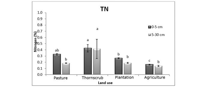 Again, at a depth of 5-30, the thornscrub exhibited the highest N content (0.42%); the pasture, plantation and agriculture lands registered statistically lower and equal contents (Figure 4). These results are consistent with Carvajal (2008), who determined that the carbon and nitrogen contents vary according to the soil depths in such land uses as pastures, in the surface layer (0-10 cm) of which the largest amounts of these elements were stored, unlike what happened in a plantation of a Colombian variety of coffee, where these elements were distributed across the entire profile. Likewise, Lawal et al. (2009) observed that the TN in an Alfisol in Nigeria decreased when the native vegetation was replaced by a plantation of eucalyptus, but increased when it was changed to an agricultural system; furthermore, they point out that this was due to the effect of the fertilizers used in agriculture.