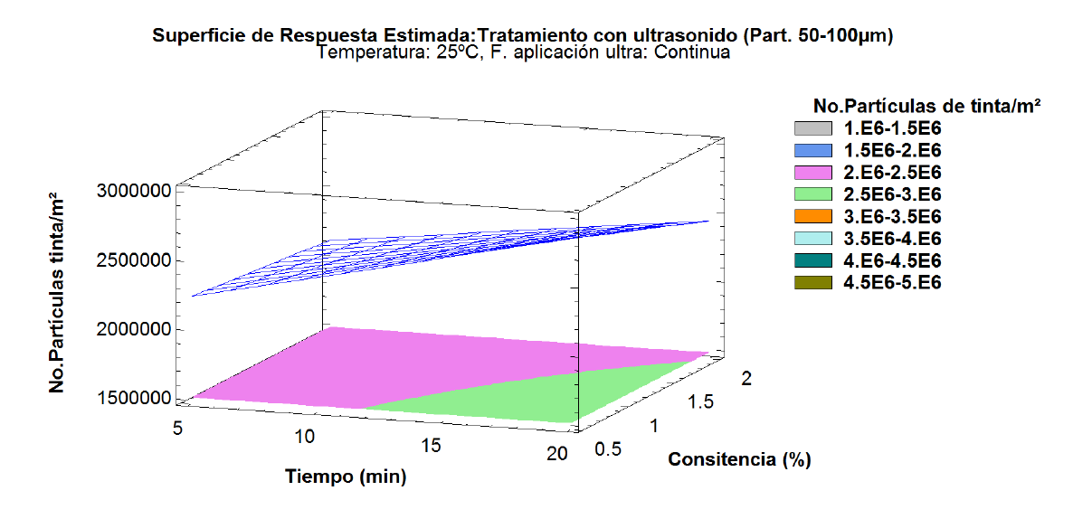 No. partículas tinta/m2 = Number of ink particles/m2; Tiempo = Tiempo; Consistencia= Consistency; Superficie de respuesta estimada = Estimated response surface; Tratamiento con ultrasonido = Treatment with ultrasound; Part entre 50-100 μm = Particle between 25-50 μm; Temp. = Temperature; Forma de aplic. = Application form; Continua = Continuous.