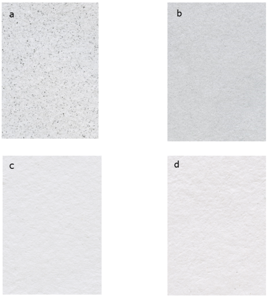 Figure 3c shows the surface of a sheet obtained with treated paste at the later stages of ultrasound and flotation, in which the elimination of a large amount of toner particles is evident. The surface of the sheet showed a reduction of the gray-blue shade originally observed. Finally, Figure 3d shows the properties of the sheet formed after the ultrasound, flotation and washing phases. This surface represents the highest reduction of ink particles, which gave a greater whiteness to the paper.