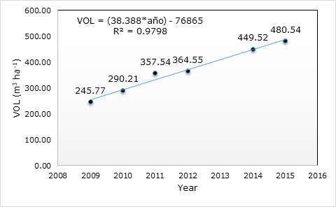 Based on the volumetric stock in the plantation, from 2009 to 2015, a model was developed to represent the accumulation of wood volume over time and apply that model after the implementation of the thinning of the end of 2015, even though the model could underestimate the volume of wood after thinning, given that with this treatment, the resources of the site are redistributed in a smaller population of trees, which improves growth (López and Flores, 2016).