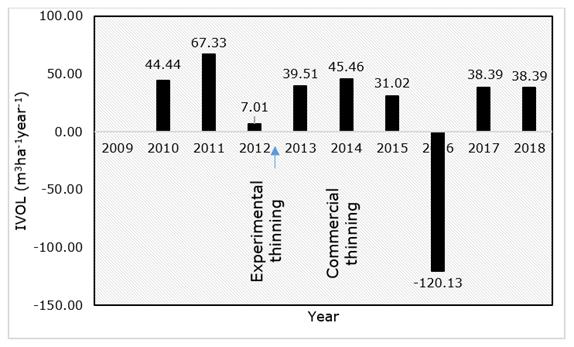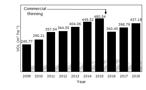Figure 4 shows the volumes recorded annually for the period between 2009 and 2015, as well as the volumes predicted for the period after commercial thinning.