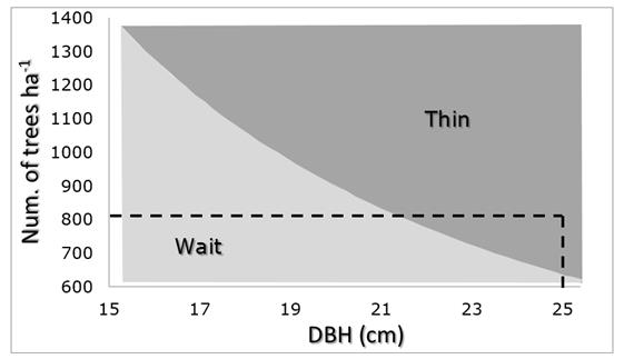The prescription of a thinning in 2015 is also supported in the density guide for pine plantations for timber production, proposed by Traugott and Dicke (2006) (Figure 3). The plantation under study had 813 trees ha-1 in 2015 and an average DBH of 25 cm. According to the aforementioned density guide, adapted to the metric system, the interception of these values falls within the "thinning area" since it is located above the threshold line between thinning and no-thinning (Figure 3).