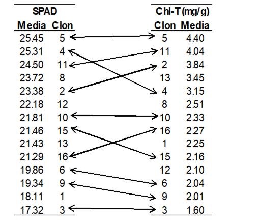Clones 8, 10, 3, 11 and 9 were correlated, mainly between SPAD and CHL-T, cataloged as high, while for 1, 12, 13 and 16 they were low (<0.30). The identification of these groups suggests that there is a marked variability between genotypes, which at the beginning can be explained by differences in the degree of maturity and sheet in the evaluated leaves of each plant at the time of taking the measurement. Calvo et al. (2008), Crespo et al. (2011), Rojas et al. (2012) and Umazi et al. (2016) agree about attributing the variability in the content of chlorophylls and / or carotenoids to situations of water stress; however, this would not be extensive to the present investigation, since homogeneity was guaranteed in the experimental conditions in which all the genotypes were developed during the evaluation period (Puttonen, 1989; Mattsson, 1996; Rojas et al., 2012).