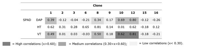 Clones 12 and 10 achieved the highest correlations between SPAD - DAP and SPAD - HT; clones 1 and 8 showed mean values for the same correlations, and the remaining genotypes, very low values between the SPAD reading and all the mensuration variables (<0.18).