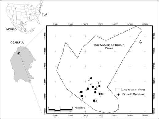 The study area was located at the Pilares ranch, which functions as a conservation area (Figure 1); it is located between the geographic coordinates 29°22.45' and 28°42.21' N, and 102°56.23' and 102°21.08' W, at an altitude of 1 182 m. The average annual precipitation is 237.5 mm, and the average temperature is 21.5 °C. It belongs to the physiographic province of the Eastern Sierra Madre, in the subprovince of the Sierras and plains of Coahuila (INEGI, 1983). The predominant soils are kastanozems, calcic soils, rendzins, chromic vertisols, lithosols and calcaric regosols (SPP 1982a; 1982b; 1983). The different types of vegetation present are oak (Quercus), pine (Pinus) and fir (Abies) forests; submontane shrubs; grasslands, and Chihuahuan desert shrublands, which include microphyllous and rosetophyllous shrubs, and halophilic and gypsophila communities (INE-Semarnap, 1997, cited by Medina-Guillén et al., 2017a).