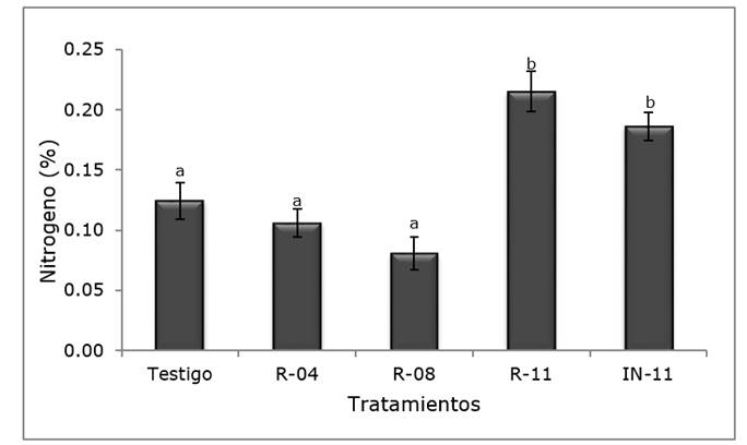 Tukey’s mean comparison test (p≤0.05) showed differences between the treatments in the two types of vegetation. For the microphyllous desert shrubs, the values of the tN contents ranged from 0.080 %, with the treatments at R-04 and R-08, followed by the control area, with 0.174 %, to BA-11 with 0.195 %; while the treatment at R-11 showed the largest increase, with a tN content of 0.261 % (Figure 3). No differences are shown between the R-04 and R-08 treatments, but the contents were lower than in the control. In the short term, an increase in the nitrogen content is produced by the treatments R-11 and BA-11.