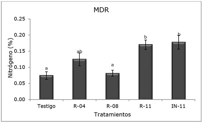 MDR= RDS; Testigo = Control; Tratamientos = Treatments; Nitrógeno = Nitrogen; IN-11 = BA-11