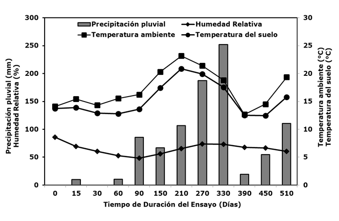 Figure 2 shows the mean air temperature, the mean soil temperature and the mean relative humidity, as well as the monthly precipitation recorded during the study period. Rainfall was 719 mm in 2017 and 184 mm at the end of the experiment, with maximum peaks in September and November, with a total of 903 mm. The air temperature ranged from 14 to 23 °C and there was no frost, while the relative humidity was 48 to 85 %. The soil temperature followed the same trend as the environmental one, with variations from 12 to 20 °C.