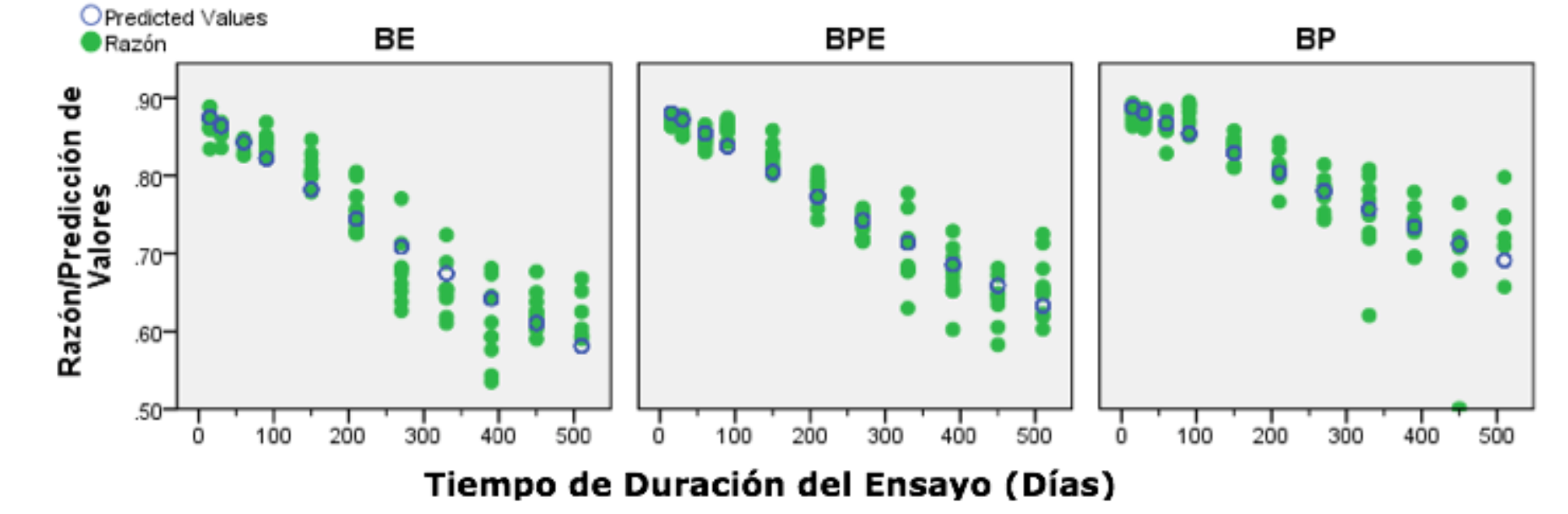 The prediction of leaf litter decomposition (Figure 4) indicates the distribution of data (relative weight of leaf litter) and the prediction of values for each type of forest (Olson model), during the time of the test. It is possible to notice the dispersion of the data in each type of forest and the prediction that the data should have during the experiment, according to the referred model.